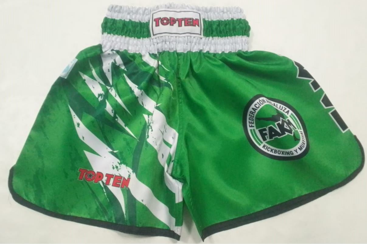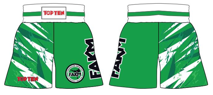 Con los pantalones cortos de kickboxing oficiales “FAKM” de TOP TEN, puedes subir fácilmente al ring. El material no solo llama la atención , sino que también es increíblemente suave para la piel y proporciona las condiciones ideales para un control equilibrado de la temperatura . A pesar del ajuste ancho , los pantalones se ajustan perfectamente gracias a la cintura elástica . Como pantalón corto oficial, el “modelo FAKM” cumple todas las exigencias de libertad de movimiento y comodidad. Las tela ancha de malla es transpirable y proporciona suficiente aire fresco para los combates mas exigentes.