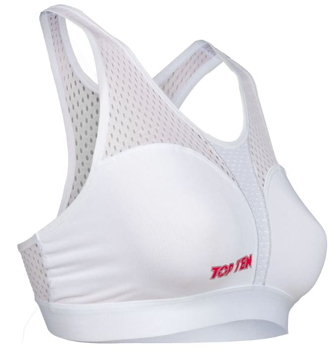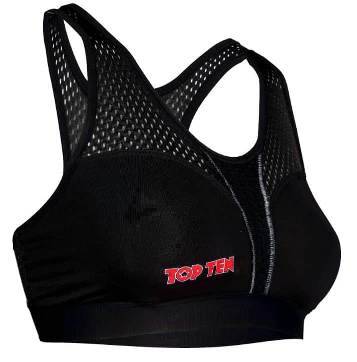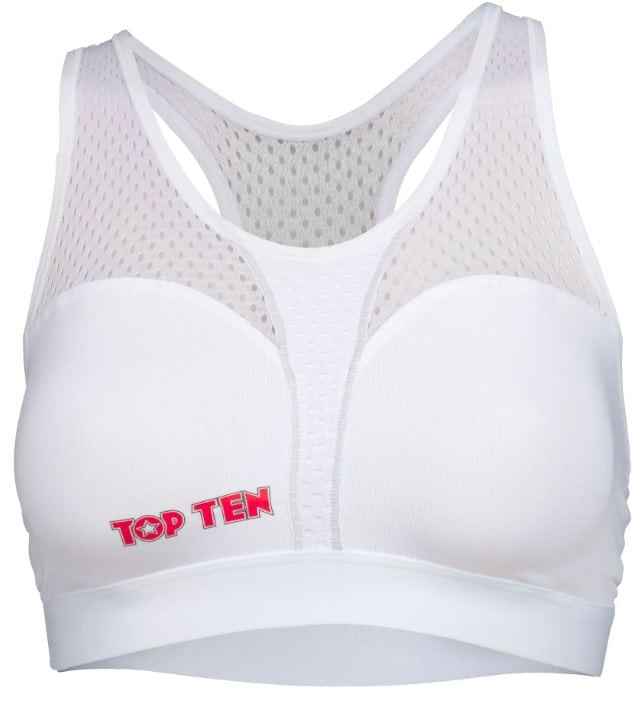 En las artes marciales, las niñas y las mujeres deben usar un protector de pecho adecuado. Con el “Cool Guard” de TOP TEN obtienes un sujetador deportivo superior , se puede complementar con copas. El componente principal del “Cool Guard” es una malla transpirable . Por lo tanto, TOP TEN garantiza una súper comodidad de uso, liviana y agradable para la piel. Los tirantes anchos de la parte superior corren en la espalda en X y dan el soporte necesario incluso a un busto grande. El acabado elástico es flexible debajo del área del pecho y evita el deslizamiento durante los movimientos mas dinámicos.